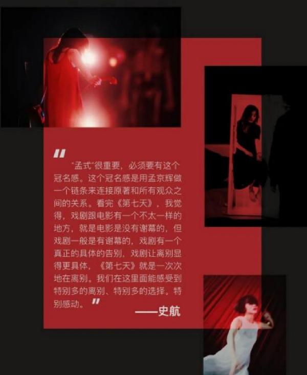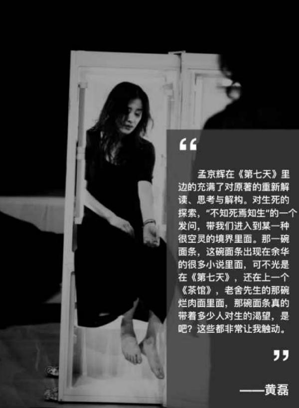 继《活着》之后,孟京辉再度改编余华,在忠于原著的基础上加入一切能带来失衡感的元素。他从古希腊神话中汲取灵感,加注人性与神性的思考;又联合视觉艺术家张武、灯光设计师王琦,共同打造出一个亦真亦幻的高反差的舞台奇景。同时,EB Virus现场乐队更是为故事注入了散文诗一般的情绪,而陈明昊、梅婷、黄湘丽三位主演纷纷献唱,让《第七天》在强烈的视觉与声音世界中展开。