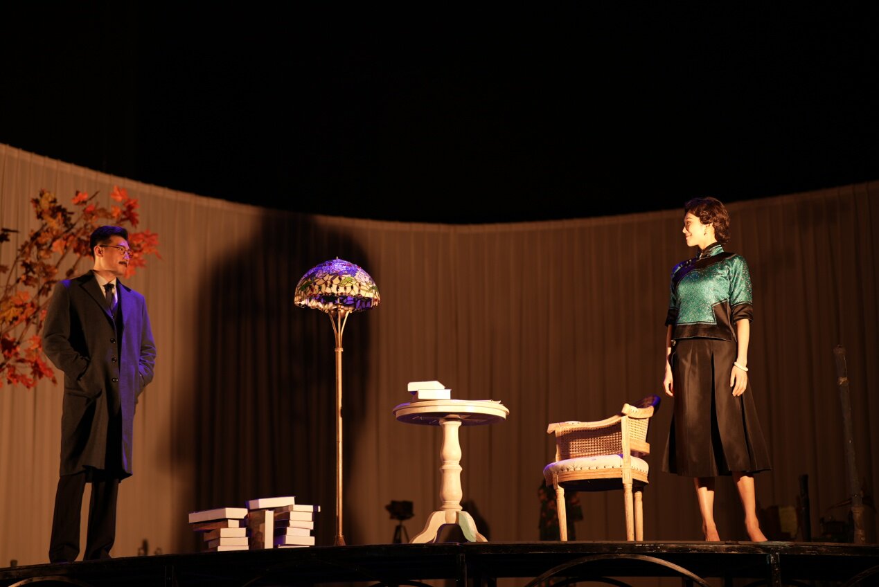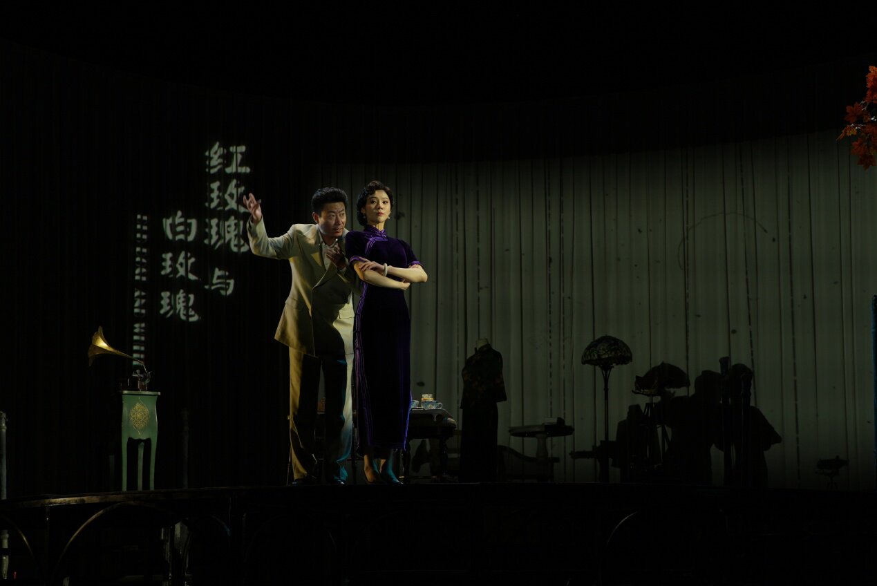 当舞台上另一层架高了的铁台轮转起来时,《半生缘》里的顾曼桢与沈世钧在大雪纷飞里断了联系,那一封封寄出的信件变成一片片洒满舞台的雪花,满目凄迷;《红玫瑰与白玫瑰》里的佟振保拿着苹果,与王娇蕊眉目传情;《小团圆》里的盛九莉与邵之雍在琉璃灯前签下一纸婚约,“愿使岁月静好,现世安稳”……